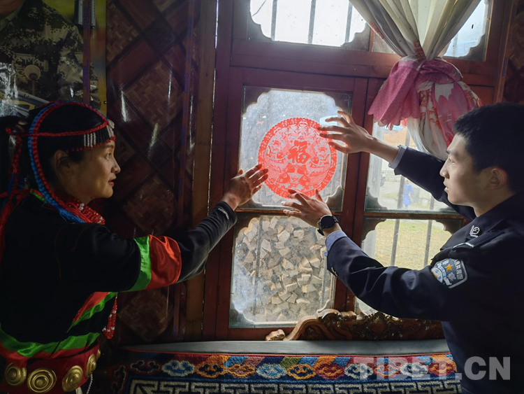 圖為轄區(qū)群眾與民警共度春節(jié),為窗戶貼福字 攝影/王濤