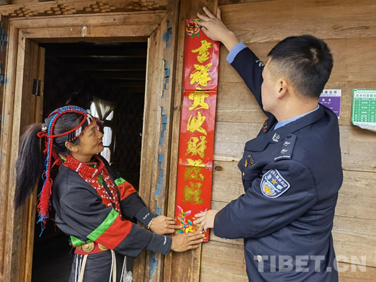 圖為林芝達木邊境派出所民警與轄區(qū)群眾共度春節(jié),為家里貼春聯(lián) 攝影:王濤