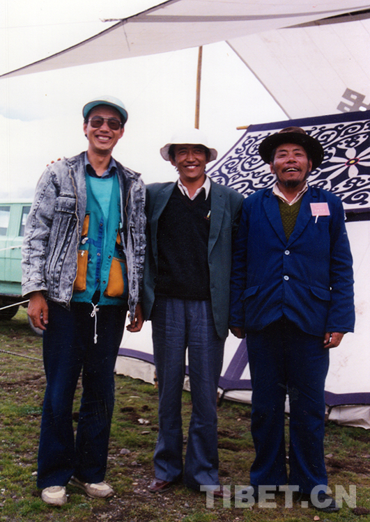 這是唐召明(左)與雙湖西亞爾公司經(jīng)理點達(dá)(右)在那曲賽馬會的帳篷前合影留念(桑瓊1987年攝)