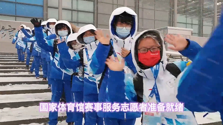 圖為一場比賽開始前,志愿者在雪中做準備工作 北京冬奧組委官網(wǎng)視頻截圖
