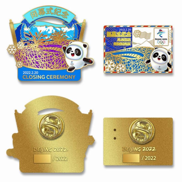 “永不落幕”北京2022年冬奧會閉幕式徽章一套兩枚,專門注明是線上專供款。兩枚徽章都以吉祥物冰墩墩、國家體育場“鳥巢”為主體,飾以雪山、雪花等,材質(zhì)均為鋅合金,采用軟琺瑯、金蔥粉印刷,以三折卡紙包裝,限量2022套。不規(guī)則形徽章高5cm、寬5.6cm,寓意賽事圓滿落幕;長方形徽章高3.1cm、寬4.5cm,以明信片造型表達(dá)了中國向世界展示冬奧會精彩賽事的愿望。