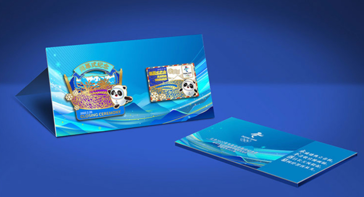 圖為“永不落幕”北京2022年冬奧會閉幕式徽章包裝展示 圖片來源:奧林匹克官方旗艦店