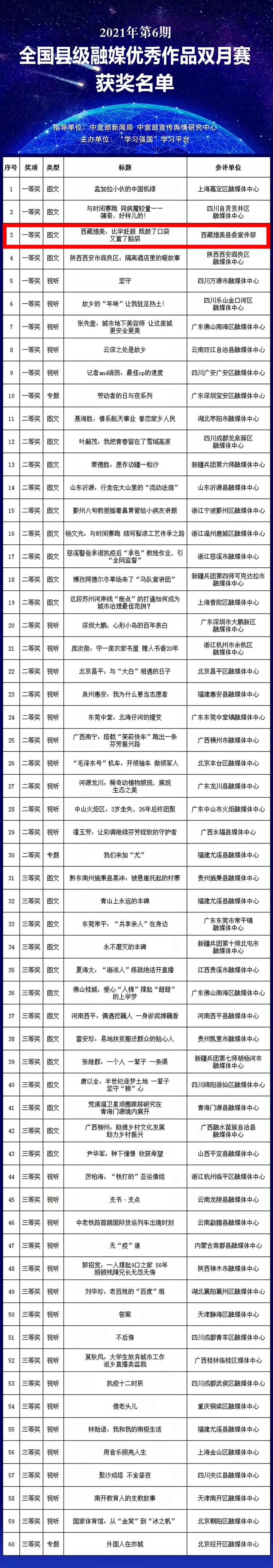 據(jù)了解,2021年第6期全國縣級融媒體中心優(yōu)秀作品雙月賽由中宣部新聞局、中宣部宣傳輿情研究中心指導(dǎo),“學(xué)習(xí)強國”學(xué)習(xí)平臺主辦,各?。▍^(qū)、市)和新疆生產(chǎn)建設(shè)兵團學(xué)習(xí)平臺協(xié)助組織、共同實施,各省級學(xué)習(xí)平臺對投稿作品進行初評,評選出299件優(yōu)秀作品,“學(xué)習(xí)強國”學(xué)習(xí)平臺組織專家評審團隊對優(yōu)秀作品進行復(fù)評、終評,最終評選出60件獲獎作品。