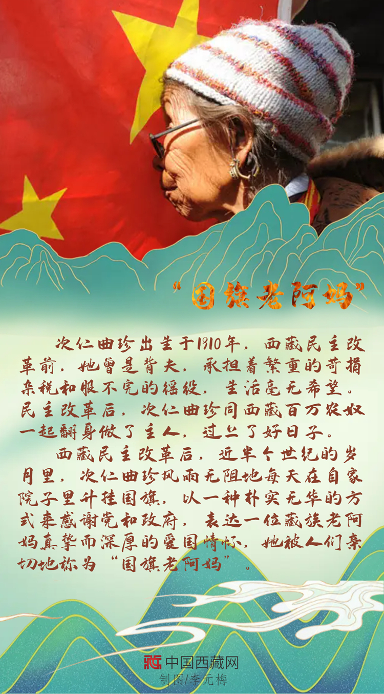 西藏民主改革后,次仁曲珍在自家院子里升起國旗,這一升就是近半個世紀,一天不落,風雨無阻。只有經歷過舊西藏的人才知道新西藏的可貴,翻身成為國家主人的“國旗老阿媽”,以上萬天堅持不渝的行動表達著自己樸素的愛國情懷。
