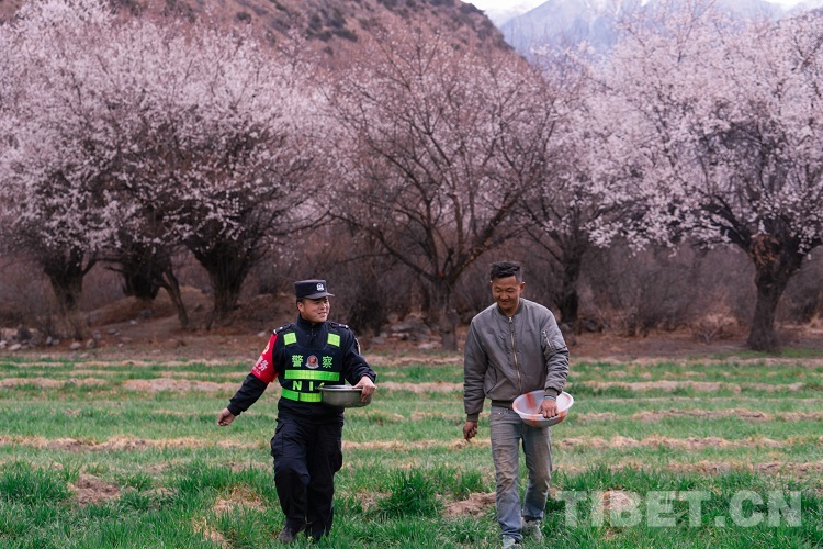 圖為民警幫助強(qiáng)巴播種