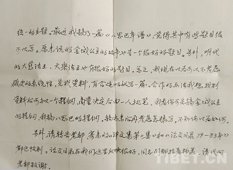 記得我大學(xué)畢業(yè)剛到新單位,人生地不熟,加之原來沉浸在“文學(xué)夢”中,現(xiàn)在陡然轉(zhuǎn)到藏族歷史研究,所謂基礎(chǔ)不牢地動山搖,困惑加不適,可想而知。陳老師在聊天中得知我的情況后,談到文史不分家,自己對文學(xué)也很有興趣,與青?!跺3薄肪庉嫼苁煜ぁ_@樣,我遇到一個學(xué)識淵博的良師益友,聆聽指教,何其難得。在陳老師的鼓勵和幫助下,我在惶惑中嘗試把歷史與文學(xué)結(jié)合起來,與他合作發(fā)表了歷史故事新編《長安和親》《香波山奇遇—吐蕃聶墀贊普的故事》等,平穩(wěn)地完成了專業(yè)變動的過渡期。后來,他離開中央民族學(xué)院到青海社會科學(xué)院工作,我們之間仍堅持信件往來,得到他很多幫助。每一次通信,我們談得最多的都是學(xué)術(shù)。在某次回信中,他談及下一步合作的工作,特別提到“至于今后如何搞,我想原來定的歷史故事新編計劃似乎是太大了一點(diǎn)。主要從藏族史的系統(tǒng)性考慮,而沒有考慮到現(xiàn)實的需要。所以我想還是先寫主題符合現(xiàn)實需要的題目,寫歌頌民族團(tuán)結(jié)、文化交流,國家統(tǒng)一的主題。最近,我搞了一篇《八思巴年譜》,覺得其中有些題目很可以寫。原來說的金城公主的故事也是一個很好的題目。另外,明代的大慈法王、大乘法王也有很好的題目??傊椰F(xiàn)在認(rèn)為可以不考慮藏族史的系統(tǒng)性,先找資料,有合適的就寫一篇。合作的辦法我想找到資料后,可擬一個提綱,商量決定后,由一人執(zhí)筆。我看你可先搞金城公主的提綱,我搞八思巴的提綱,搞出來后再考慮怎樣寫,不知你以為如何。”