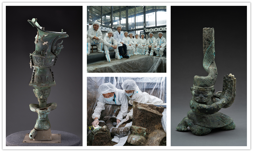 圖左為三星堆遺址三號坑出土銅頂尊跪坐人像;圖中上為部分發(fā)掘人員合影;圖中下為象牙保護與提取;圖右為三星堆遺址四號坑出土扭頭跪坐銅人像 圖片來源:國家文物局
