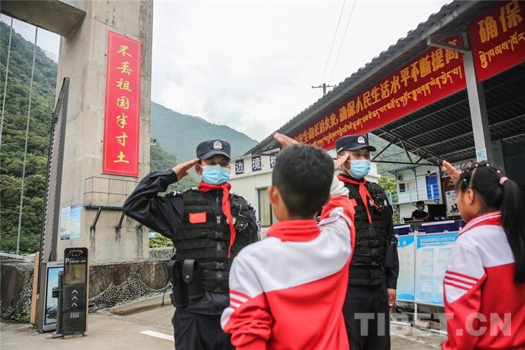 圖為學(xué)生為解放大橋的背崩邊境派出所執(zhí)勤民警系上紅領(lǐng)巾