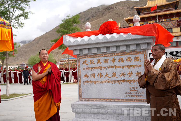 圖為班禪為西藏佛學(xué)院“建設(shè)美麗幸福西藏 共圓偉大復(fù)興夢(mèng)想”石碑揭牌 攝影:王淑