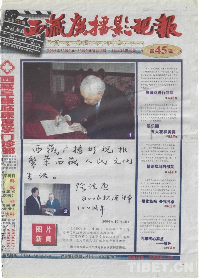 圖為載有陰書記題詞的《西藏廣播影視報(bào)》