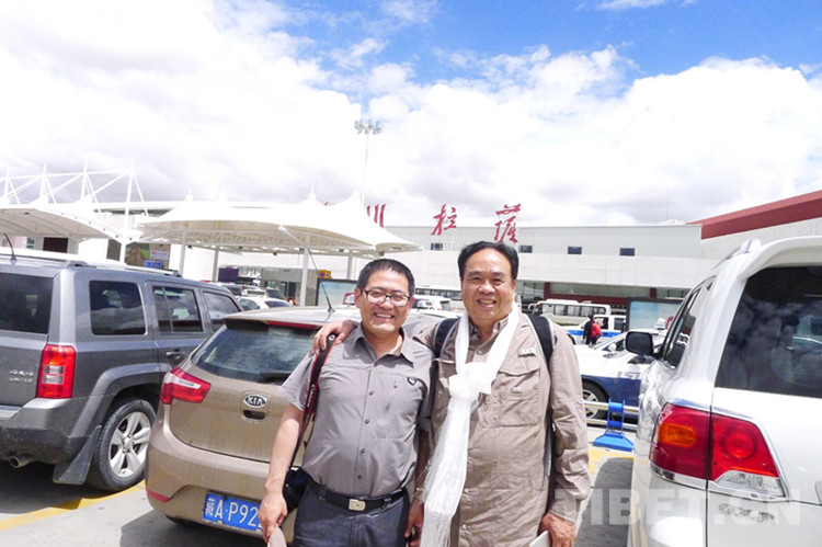 圖為時(shí)任中央人民廣播電臺、中國國際廣播電臺西藏記者站站長、現(xiàn)任中央廣播電視總臺西藏總站站長曾曉東到拉薩機(jī)場迎接。攝影 張?zhí)一?/p>
