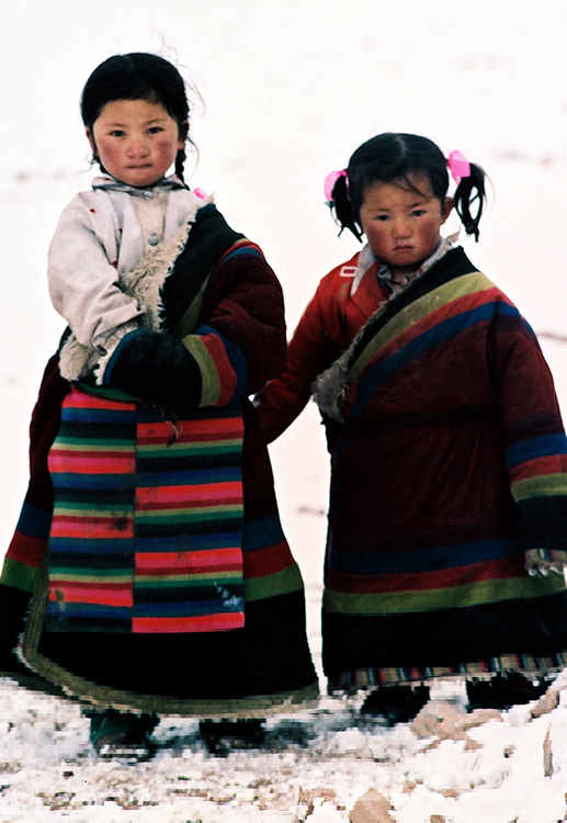 那是1989年歲末最后幾天,我隨藏北那曲地區(qū)(現(xiàn)那曲市)基層政權建設工作現(xiàn)場會“訪問團”來到文部辦事處(現(xiàn)尼瑪縣)參觀。來到卓瓦鄉(xiāng)時,我眼前突然一亮:在雪地上玩耍的草原小姐妹,三五歲的樣子,身著五彩羔皮藏袍,扎著羊角小辮,臉頰上印刻著深紫色“高原紅”。那是草原上一道最美麗的風景線,我不由得按動手中相機快門……
