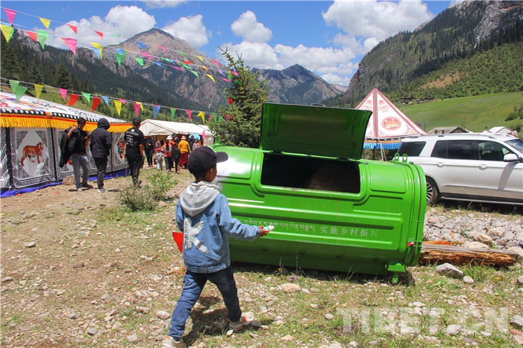 圖為2022年伊日鄉(xiāng)第二屆文化旅游藝術(shù)節(jié)上,小朋友將手中的飲料瓶扔進(jìn)垃圾箱 攝影:王茜
