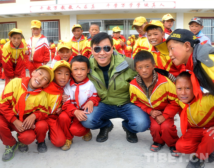這是王飛在看望中國(guó)石化班戈縣小學(xué)的藏族孩子時(shí)合影留念(唐召明提供,2013年8月30日攝)