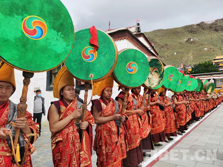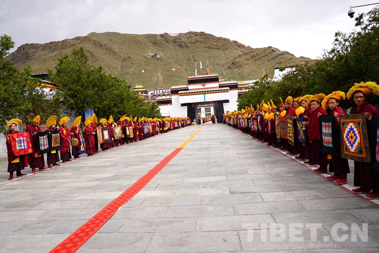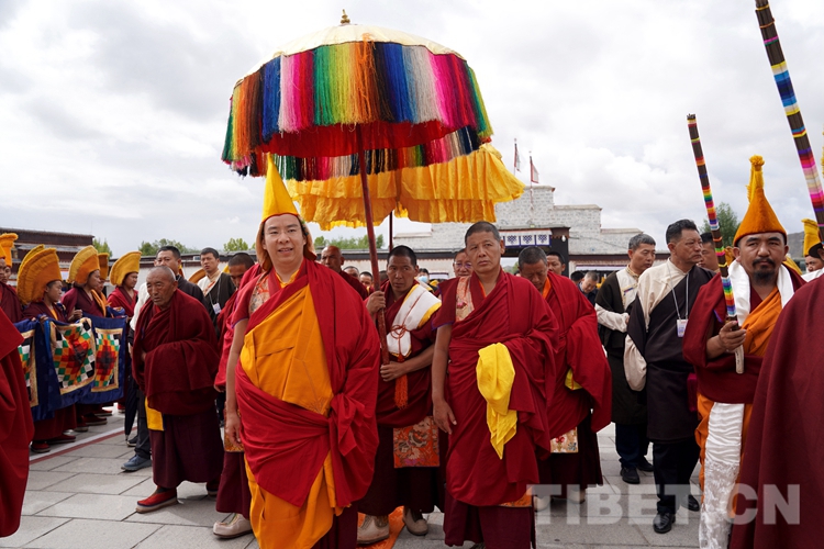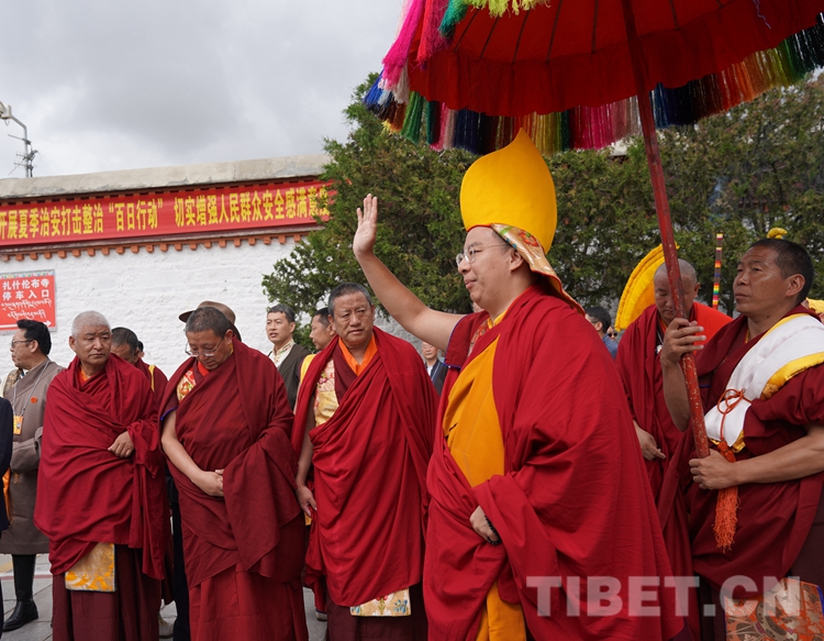 班禪抵達,現場桑煙繚繞,法號聲悠長,扎什倫布寺僧眾以藏傳佛教最高禮儀迎接班禪?,F場等候班禪的信教群眾紛紛摘帽行禮或雙手合十,向班禪的到來表示熱烈歡迎,班禪見狀揮手致意、送上祝福。隨后,班禪在手持黃傘、香爐的高僧引領下緩緩步行至措欽大殿。