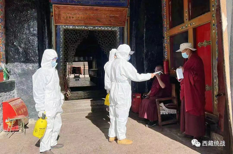 圖為西藏自治區(qū)日喀則市薩迦寺管委會在寺廟內開展疫情防控工作 圖片來源:西藏統(tǒng)戰(zhàn)微信公眾號