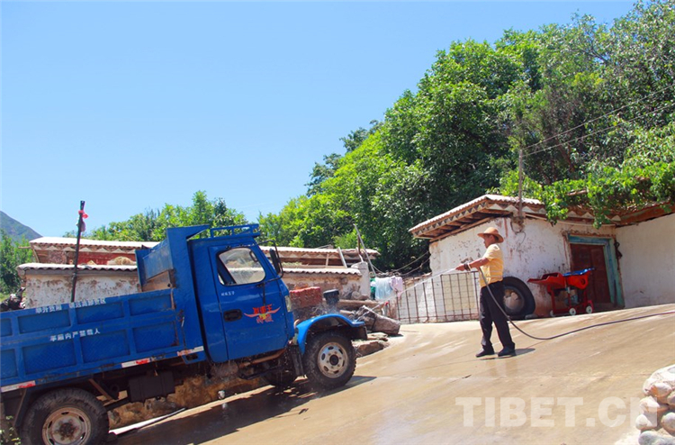 圖為丁增拉姆的父親在沖洗家里的農(nóng)用汽車(chē) 攝影:王茜