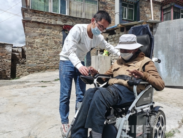圖為閆磊贈送村民仁增頓珠電動輪椅。