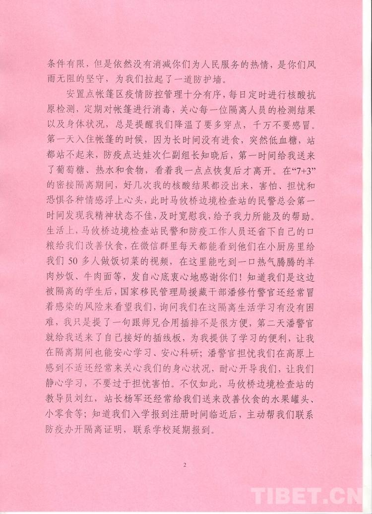 一次次走訪,一件件回應(yīng)……這一系列真實、暖心的舉動,讓馬攸橋邊境檢查站的民警與滯留群眾建立了深厚情誼,也讓2人滯留結(jié)束回到北京后,寫下了這封感謝信。陸詩鳴、張圣聽的真情流露,飽含著群眾對馬攸橋邊境檢查站民警的信任,讓這個海拔4900多米的臨時安置點顯得更加溫暖。(中國西藏網(wǎng) 通訊員/張拴根 唐彪 記者/次旦拉姆 馬攸橋邊境檢查站供圖)