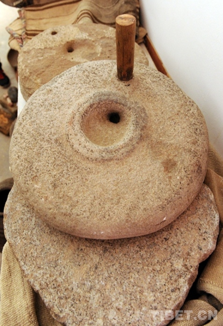 家庭生活用具,有炒青稞的平底鍋,磨糌粑的小石磨,煮“土巴”的盆和鍋。還有圓柱形的酥油筒、酥油茶筒,以及茶壺、木碗、長(zhǎng)勺子等。