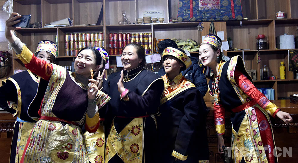 圖為工布新年“古突”夜,游客和當?shù)厝罕娚碇⒀b合影留念(資料圖)