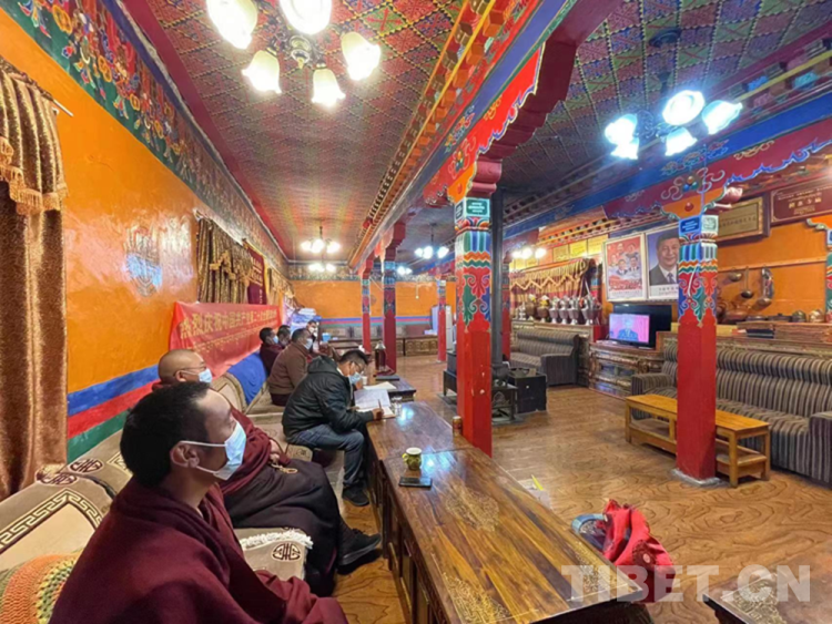 圖為10月16日上午,西藏自治區(qū)日喀則市定結縣曲果德慶林寺僧眾、駐寺干部在一起收看黨的二十大開幕會直播