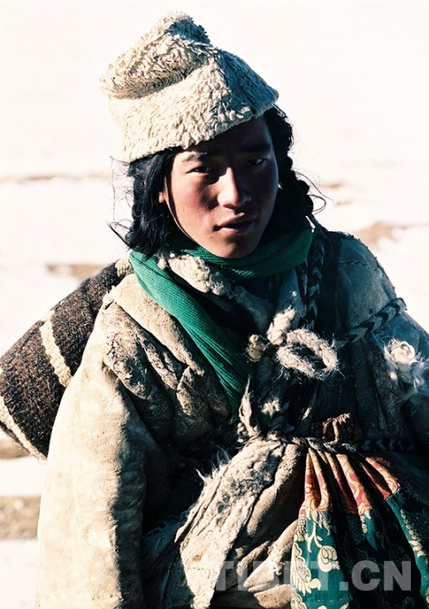 這是過(guò)去一位身著光板老羊皮袍外出旅行的青年牧民(唐召明1991年初攝)