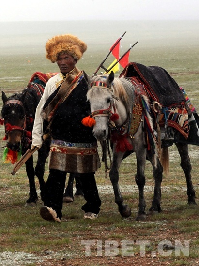 這是在慶祝雙湖建縣活動(dòng)中,一位盛裝青年牧民冒雪前去參加賽馬比賽(唐召明2013年7月26日攝)