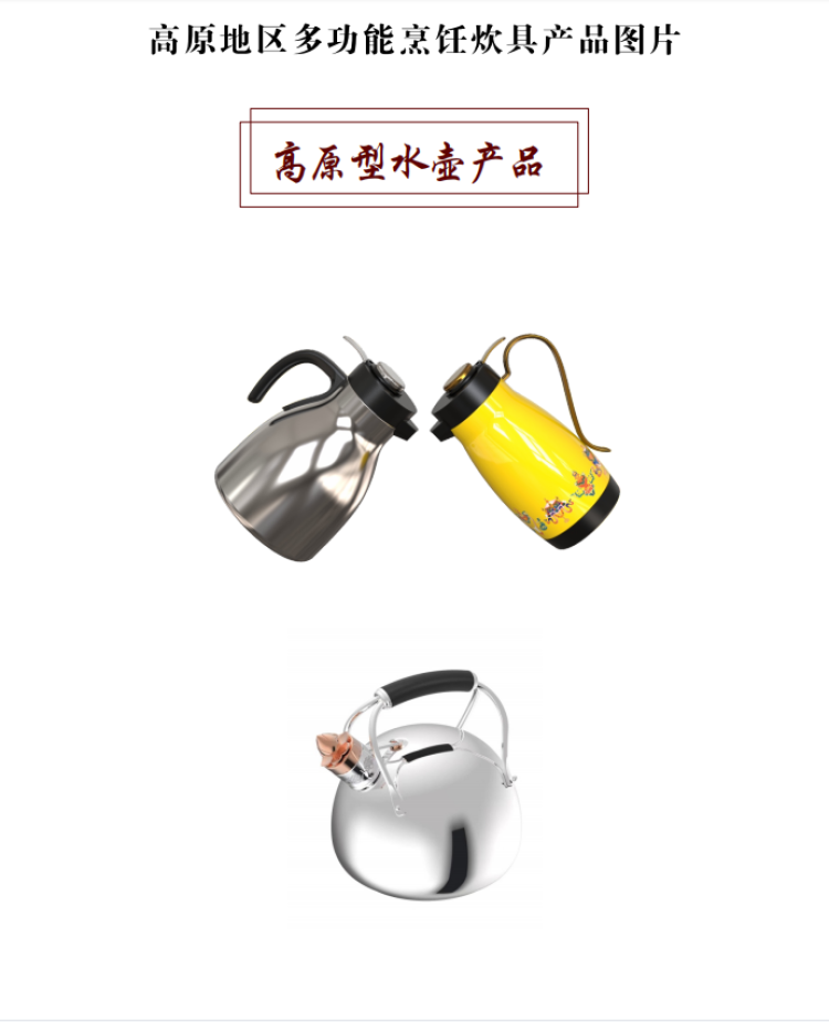 西藏自治區(qū)海拔跨度大,人民群眾生活范圍主要在800米至5000米左右,針對(duì)不同海拔高度需要不同烹飪壓力及不同烹飪時(shí)間的需求,研發(fā)的高原地區(qū)多功能烹飪炊具可實(shí)現(xiàn)一鍵調(diào)壓、多檔控壓和感溫定時(shí)功能。新研發(fā)的壓力鍋針對(duì)不同的海拔地區(qū)可以實(shí)現(xiàn)不同的壓力控制,從而在不同的沸點(diǎn)均能快速煮熟食物,實(shí)現(xiàn)與區(qū)外煮熟時(shí)間相同,且兼具口感,并保留食物更多的營(yíng)養(yǎng)成分。新研發(fā)的高原地區(qū)專用燒水壺(明火款、電子款)也實(shí)現(xiàn)了在不同海拔地區(qū)均能與區(qū)外相同時(shí)間使壺內(nèi)水沸騰后達(dá)到100℃,從而保障高原地區(qū)廣大群眾都能喝上燒開(kāi)的水。