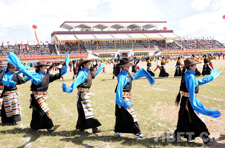 這是參加賽馬會(huì)的牧民群眾在新建的那曲民族體育賽馬場(chǎng)跳起大型“鍋莊”舞(唐召明2013年8月10日攝)