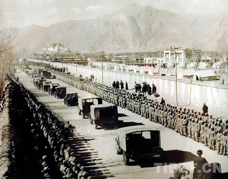 1954年12月25日,汽車第一次開進(jìn)拉薩。當(dāng)天,青藏、川藏公路正式通車,兩隊(duì)350多輛汽車披紅掛彩會(huì)師布達(dá)拉宮廣場(chǎng)(唐召明翻拍照片)