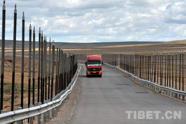 這是一輛卡車正在通過青藏公路兩邊立有一根根熱棒的凍土路段。熱棒是一種高效熱導(dǎo)裝置,可保持凍土終年不化(唐召明2015年8月12日攝)