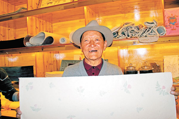 到了上世紀90年代,國家開始搶救這些瀕危的民族手工業(yè)技藝,次仁多杰看著越來越多的人參與到藏紙的搶救工作中來,堅定了繼續(xù)做下去的信念。1988年,西藏自治區(qū)檔案館為修復西藏古籍,需要大量藏紙,次仁多杰制作的雪拉藏紙就完全符合需求。此后,他與檔案館簽訂了為期18年的藏紙供應(yīng)合同。