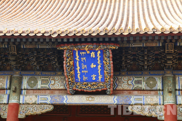 圖為雍和宮大殿匾額,從右至左,以滿文、漢文、藏文、蒙古文書寫“雍和宮” 攝影:李元梅