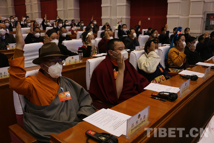 圖為政協(xié)委員舉手表決通過政協(xié)第十二屆西藏自治區(qū)委員會第一次會議選舉辦法,總監(jiān)票人、監(jiān)票人名單 攝影:王佳豪