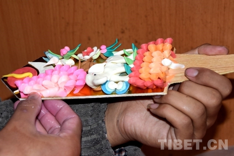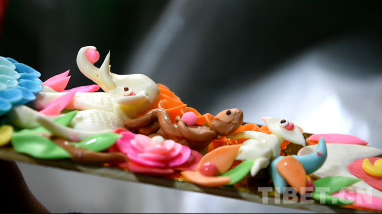 酥油花是藏民族雕塑藝術(shù)的一種特殊形式,它是以人物、花卉、樹木、飛禽、走獸等為主題的一種手工油塑藝術(shù),具有悠久的歷史。藏歷新年期間,西藏群眾會(huì)在切瑪盒的左右兩邊分別裝滿糌粑和炒青稞,然后在上面插上象征五谷豐登的“羅薩美朵”(彩色青稞穗)和寓意吉祥的酥油花。(中國(guó)西藏網(wǎng) 記者/次旦拉姆)