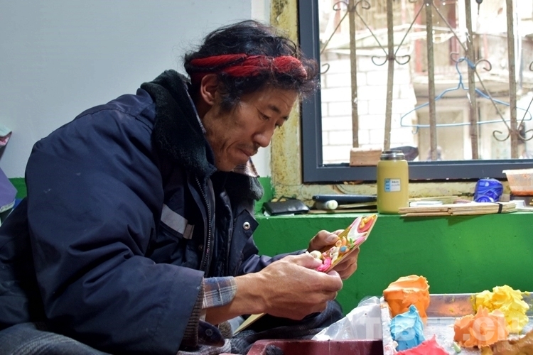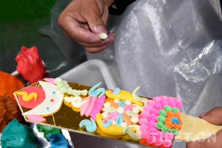 “我們一般在藏歷新年前20天左右到達(dá)拉薩。買酥油,和礦物染色原料調(diào)至成泥狀后便開始捏制?!钡┰稣f(shuō),普松鄉(xiāng)有制作酥油花的傳統(tǒng),每年藏歷新年臨近,他們便結(jié)伴來(lái)到拉薩制作酥油花銷售。