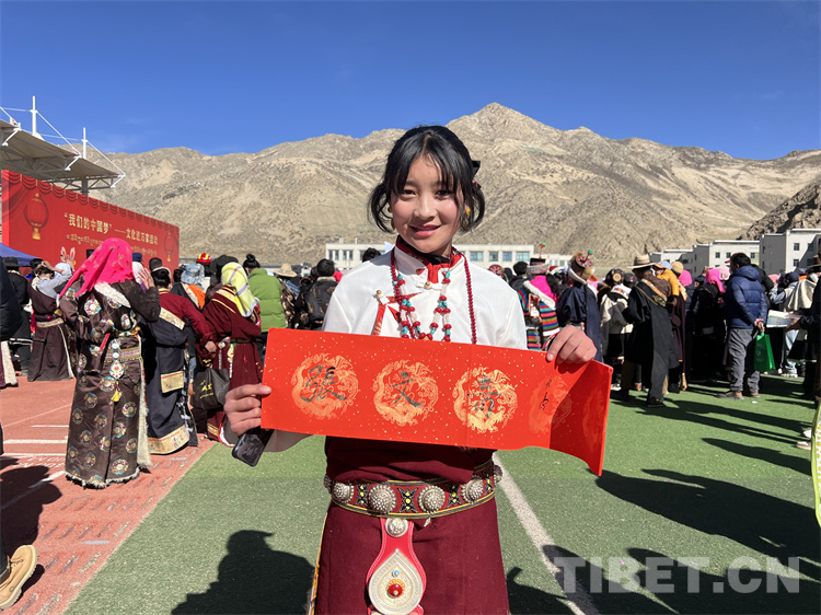 “我來(lái)自那曲安多縣,在森布日生活已有近一年,這里氣候暖,基礎(chǔ)設(shè)施齊全,真是趕上了好政策”66歲的多布杰說(shuō),他還主動(dòng)拿起書(shū)法家現(xiàn)場(chǎng)書(shū)寫(xiě)并贈(zèng)送給他的吉祥對(duì)聯(lián)說(shuō):“今天真是很開(kāi)心,觀看了一場(chǎng)精彩的節(jié)目,還得到了書(shū)法家寫(xiě)的‘扎西德勒’吉祥對(duì)聯(lián),這個(gè)我要貼在家里的門(mén)窗上”。
