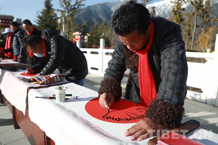 在林芝市藏醫(yī)院工作的巴桑次仁,是林芝市文聯(lián)書法家協(xié)會會員。當天一大早,林芝市文聯(lián)書法家協(xié)會的各位書法家揮毫潑墨,不停地為群眾寫下新年祈福和愿望?,F(xiàn)場群眾簇擁觀摩,與書法家們認真交流,臉上不時揚起幸福的笑容。據(jù)悉,活動當天,書法家協(xié)會共送出100余副春聯(lián)、150余幅字畫。