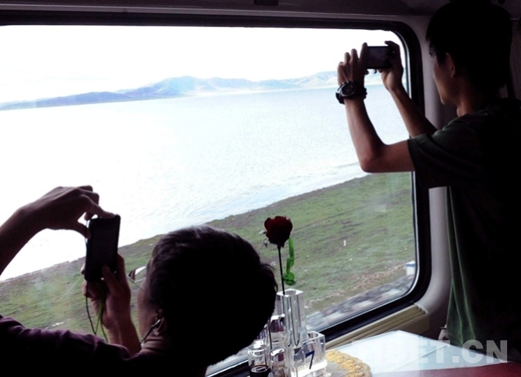 這是京藏列車通過西藏錯(cuò)那湖時(shí),旅客們紛紛用手機(jī)拍攝美景(唐召明2012年8月12日攝)