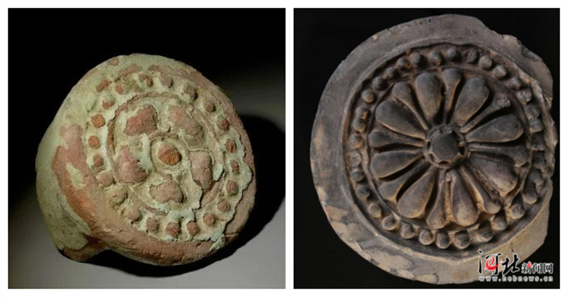 圖為西藏曲水溫江多遺址出土的綠釉紅陶帶筒瓦蓮花瓦當(dāng)(左圖片來(lái)源:國(guó)家文物局)與河北正定開(kāi)元寺附近出土的唐代蓮花紋瓦當(dāng)(圖右圖片來(lái)源:燕趙都市報(bào))紋樣對(duì)比