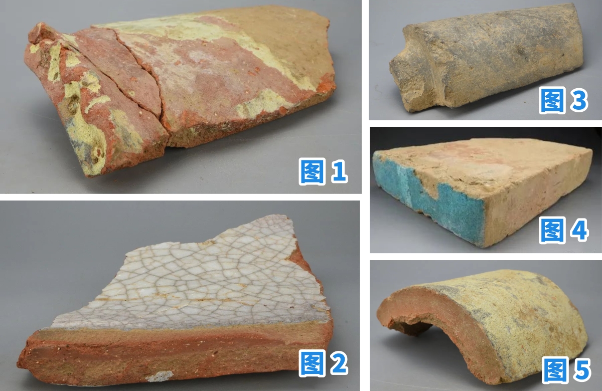 圖為西藏曲水溫江多遺址出土的各種建筑材料,圖1為綠釉紅陶花口板瓦殘塊、圖2為白釉紅陶板瓦殘塊、圖3為帶刻痕帶瓦舌灰陶筒瓦殘塊、圖4為藍(lán)釉琉璃磚、圖5為綠釉紅陶筒瓦殘塊 圖片來(lái)源:國(guó)家文物局供圖拼合