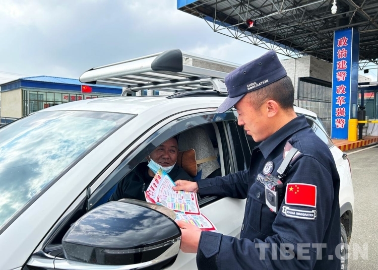 圖為錯(cuò)那邊境檢查站執(zhí)勤民警為過(guò)往旅客發(fā)放宣傳單