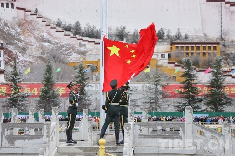 28日清晨,瑞雪洗禮拉薩,處處煥然一新,在干凈清新的氣息中,來自西藏各族各界的代表2000余人齊聚布達拉宮廣場,以升國旗、唱國歌的方式紀念百萬農(nóng)奴解放64周年。