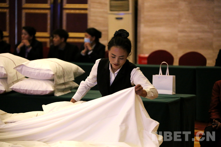 中國西藏網訊 5月11日,由西藏自治區(qū)旅游發(fā)展廳、西藏自治區(qū)總工會、共青團西藏自治區(qū)委員會、西藏自治區(qū)婦女聯(lián)合會主辦,西藏旅游飯店業(yè)協(xié)會承辦的2023年西藏自治區(qū)星級飯店從業(yè)人員服務技能競賽在拉薩開賽。45名選手圍繞中餐宴會擺臺、西餐宴會擺臺、中式鋪床及夜床服務、前廳服務4個項目同臺競技。