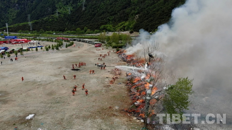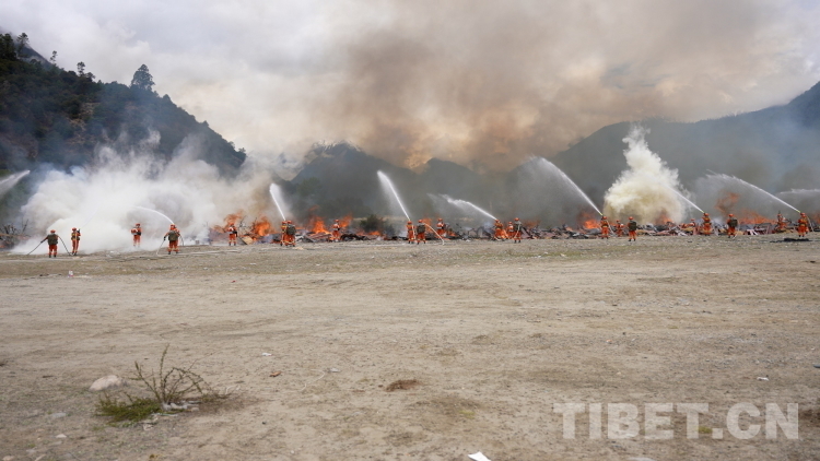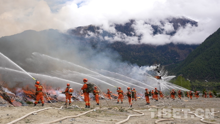 圖為林芝市森林消防支隊救援人員在“應(yīng)急使命·西藏2023”抗震救災(zāi)實戰(zhàn)化演習(xí)中撲打火線。