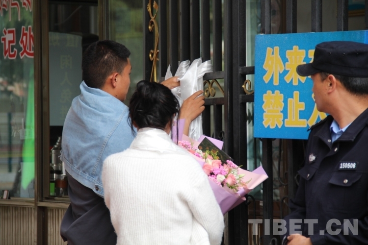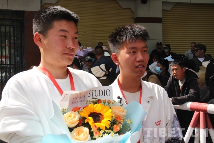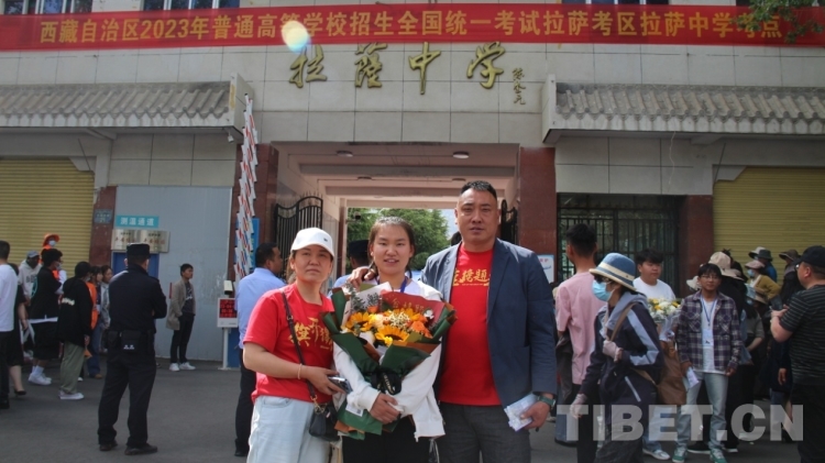 6月8日下午,在拉薩中學考場外,家長們穿著藏裝、旗袍、印有“金榜題名”“旗開得勝”等加油短袖,手捧鮮花和哈達迎接第一波結(jié)束高考的考生?!敖裉欤|女終于要結(jié)束高中生活了,希望她能如愿考上軍校?!眲?span style="background-color: rgb(255,255,255)">先生夫婦穿著專門為女兒定制的加油短袖,備好鮮花到考場外迎接女兒。像他們一樣,考場外拿著鮮花與哈達、祝賀橫幅、勵志牌等的考生家屬和親戚漸漸多了起來。