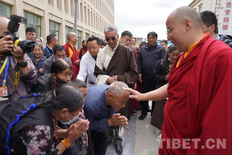 圖為班禪對醫(yī)院群眾進(jìn)行摸頂賜福 攝影:王淑