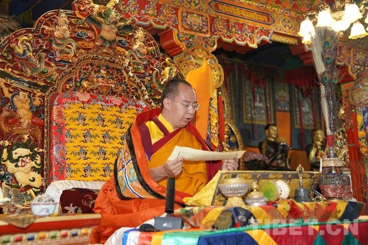 當日11時許,在眾僧的期盼中,班禪一行抵達直孔替寺。頓時,現(xiàn)場法號齊鳴、法螺合奏,直孔瓊倉·洛桑強巴活佛和僧眾在寺廟前舉行了隆重的歡迎儀式。