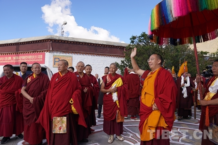 班禪一行順利抵達后,現(xiàn)場桑煙繚繞、法號長鳴,扎什倫布寺高僧代表向班禪敬獻哈達,班禪向僧眾及在此等候的信眾們揮手致意。隨后,班禪在手持黃傘、香爐的高僧引領下徐徐而行,經(jīng)多加大院進入措欽大殿。